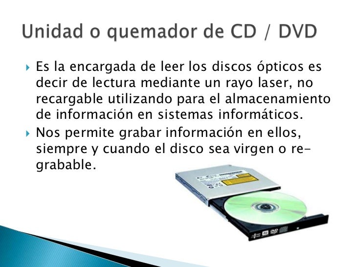 - 11. Es la encargada de leer los discos ópticos es decir de lectura mediante un rayo laser, no recargable utilizando para el almacenamiento de información en sistemas informáticos. Nos permite grabar información en ellos, siempre y cuando el disco sea virgen o re- grabable.