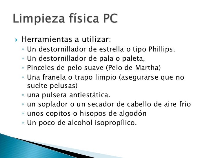 - 16. Herramientas a utilizar: ◦ Un destornillador de estrella o tipo Phillips. ◦ Un destornillador de pala o paleta, ◦ Pinceles de pelo suave (Pelo de Martha) ◦ Una franela o trapo limpio (asegurarse que no suelte pelusas) ◦ una pulsera antiestática. ◦ un soplador o un secador de cabello de aire frio ◦ unos copitos o hisopos de algodón ◦ Un poco de alcohol isopropílico.