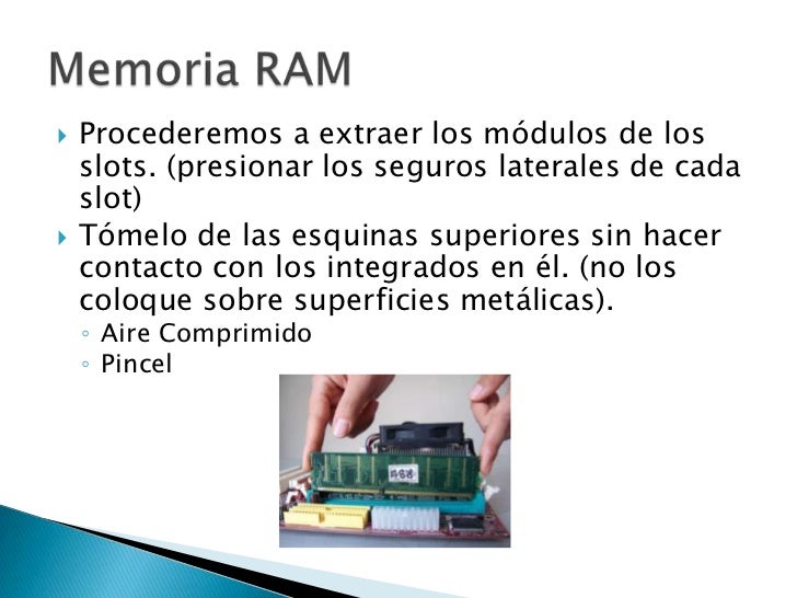 - 19. Procederemos a extraer los módulos de los slots. (presionar los seguros laterales de cada slot) Tómelo de las esquinas superiores sin hacer contacto con los integrados en él. (no los coloque sobre superficies metálicas). ◦ Aire Comprimido ◦ Pincel