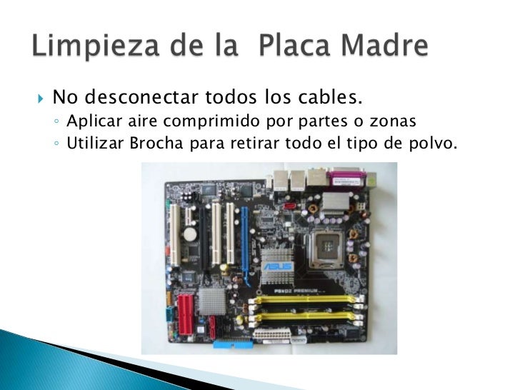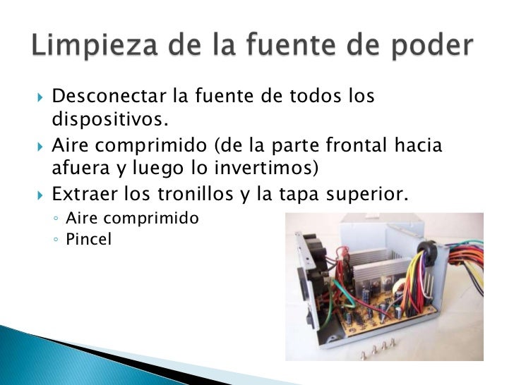 - 21. No desconectar todos los cables. ◦ Aplicar aire comprimido por partes o zonas ◦ Utilizar Brocha para retirar todo el tipo de polvo.