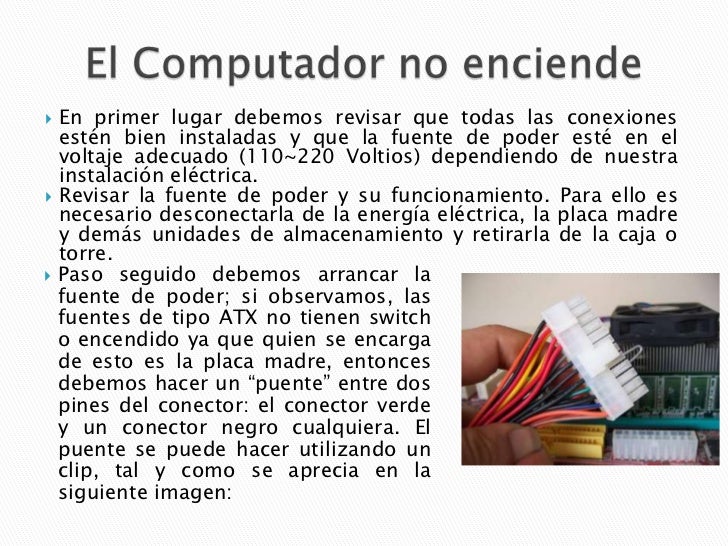 - 24. En primer lugar debemos revisar que todas las conexiones estén bien instaladas y que la fuente de poder esté en el voltaje adecuado (110~220 Voltios) dependiendo de nuestra instalación eléctrica. Revisar la fuente de poder y su funcionamiento. Para ello es necesario desconectarla de la energía eléctrica, la placa madre y demás unidades de almacenamiento y retirarla de la caja o torre. Paso seguido debemos arrancar la fuente de poder; si observamos, las fuentes de tipo ATX no tienen switch o encendido ya que quien se encarga de esto es la placa madre, entonces debemos hacer un “puente” entre dos pines del conector: el conector verde y un conector negro cualquiera. El puente se puede hacer utilizando un clip, tal y como se aprecia en la siguiente imagen: