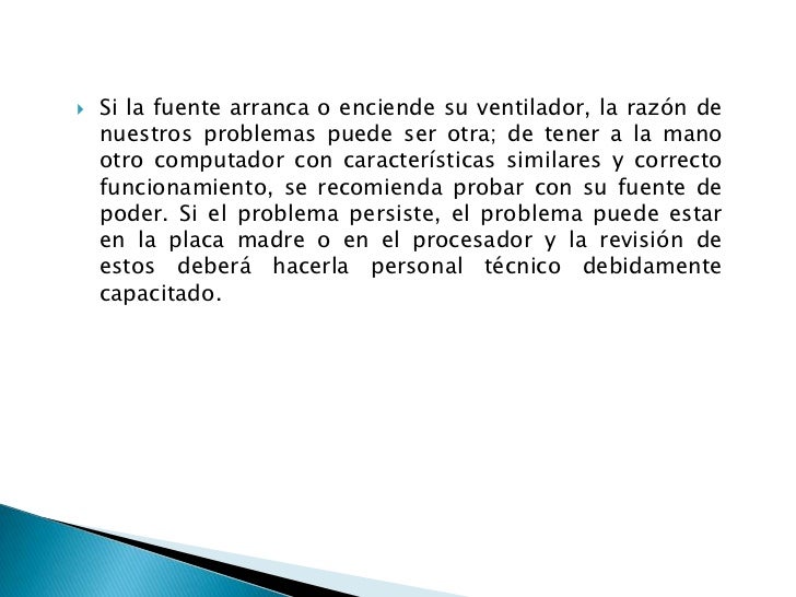 - 25. Si la fuente arranca o enciende su ventilador, la razón de nuestros problemas puede ser otra; de tener a la mano otro computador con características similares y correcto funcionamiento, se recomienda probar con su fuente de poder. Si el problema persiste, el problema puede estar en la placa madre o en el procesador y la revisión de estos deberá hacerla personal técnico debidamente capacitado.