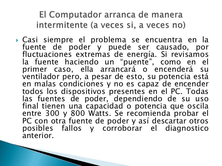 - 26. Casi siempre el problema se encuentra en la fuente de poder y puede ser causado, por fluctuaciones extremas de energía. Si revisamos la fuente haciendo un “puente”, como en el primer caso, ella arrancará o encenderá su ventilador pero, a pesar de esto, su potencia está en malas condiciones y no es capaz de encender todos los dispositivos presentes en el PC. Todas las fuentes de poder, dependiendo de su uso final tienen una capacidad o potencia que oscila entre 300 y 800 Watts. Se recomienda probar el PC con otra fuente de poder y así descartar otros posibles fallos y corroborar el diagnostico anterior.