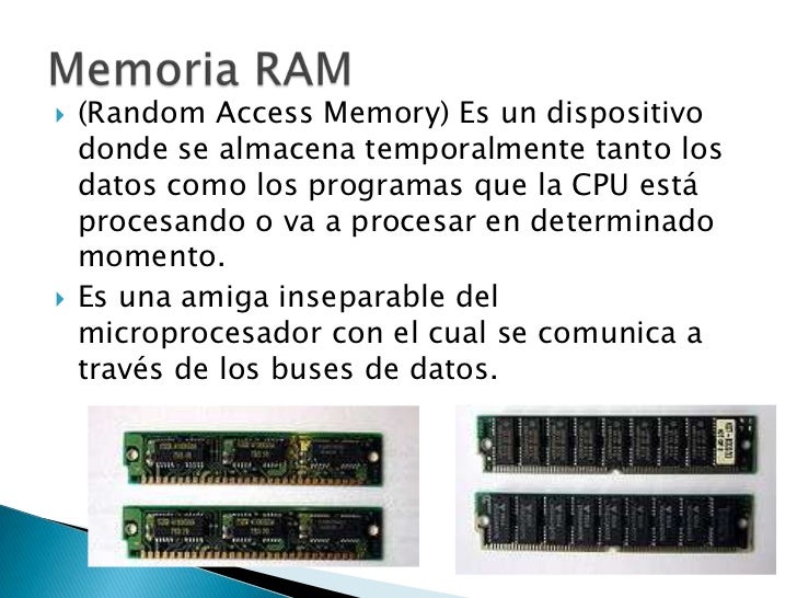 - 7. (Random Access Memory) Es un dispositivo donde se almacena temporalmente tanto los datos como los programas que la CPU está procesando o va a procesar en determinado momento. Es una amiga inseparable del microprocesador con el cual se comunica a través de los buses de datos.